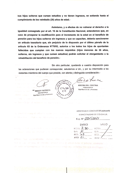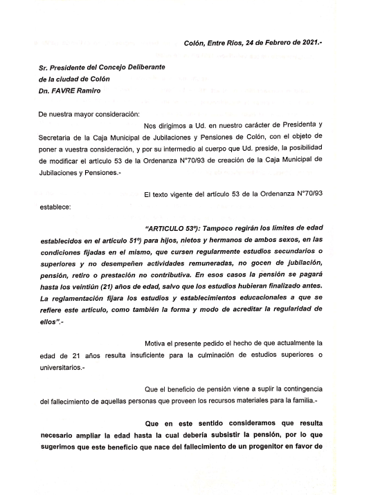 En una nota presentada días atrás ante el Honorable Concejo Deliberante de la Municipalidad de Colón, el Directorio de la Caja Municipal de Jubilaciones y Pensiones de Colón solicita realizar una modificación en la ordenanza de creación de la Caja, en su artículo Nº53, límite de cobro de Pensión en jóvenes en carácter de estudiantes.